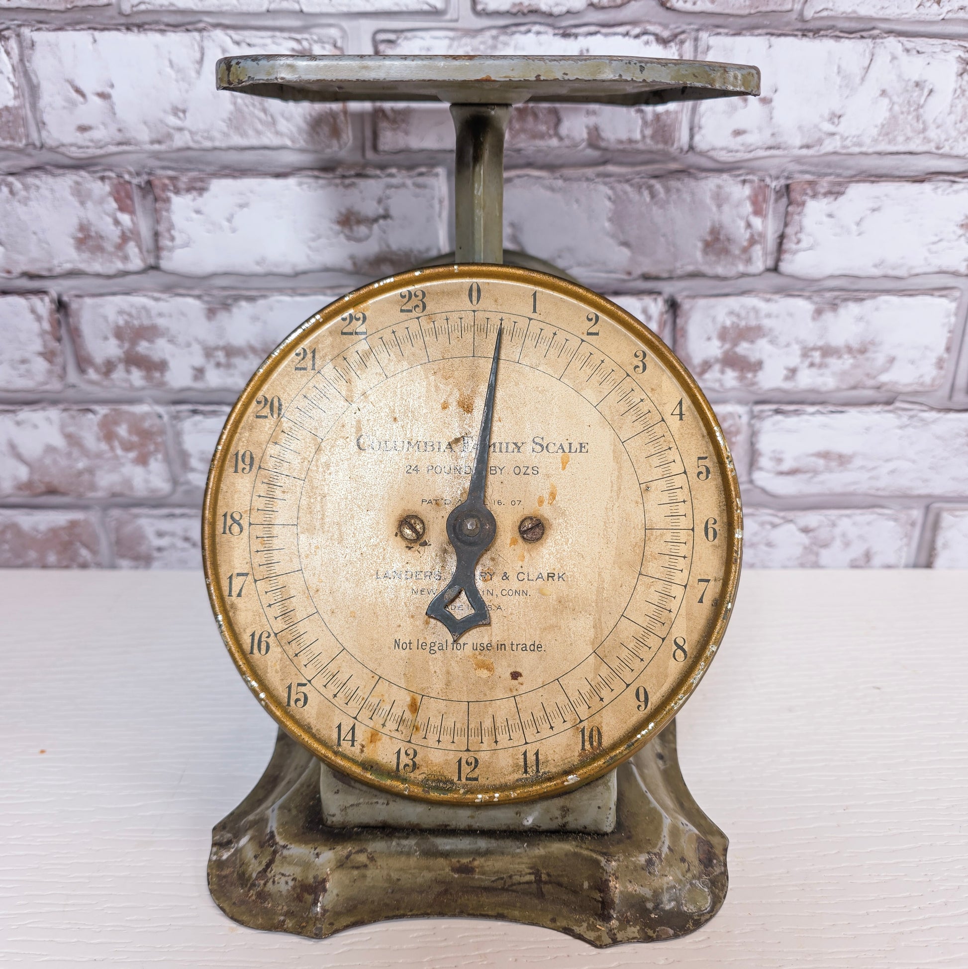 A genuine antique Columbia Family Scale with beautifully aged patina and classic industrial character. Made by Landers, Frary & Clark of New Britain, Connecticut, this piece showcases original metal construction, an aged dial, and the timeless design that makes antique scales so collectible.