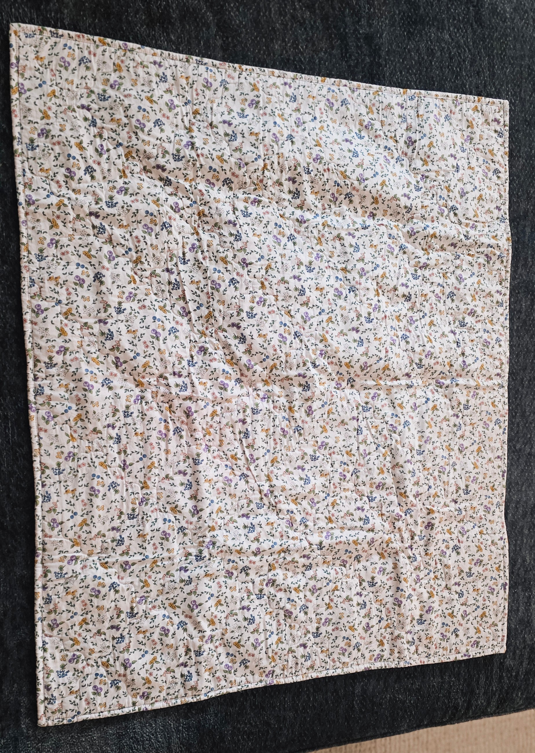 The quilt is reversible, with the back featuring a soft floral fabric that complements the patchwork front. Its size makes it perfect for use as a baby quilt, lap quilt, stroller blanket, or decorative throw.