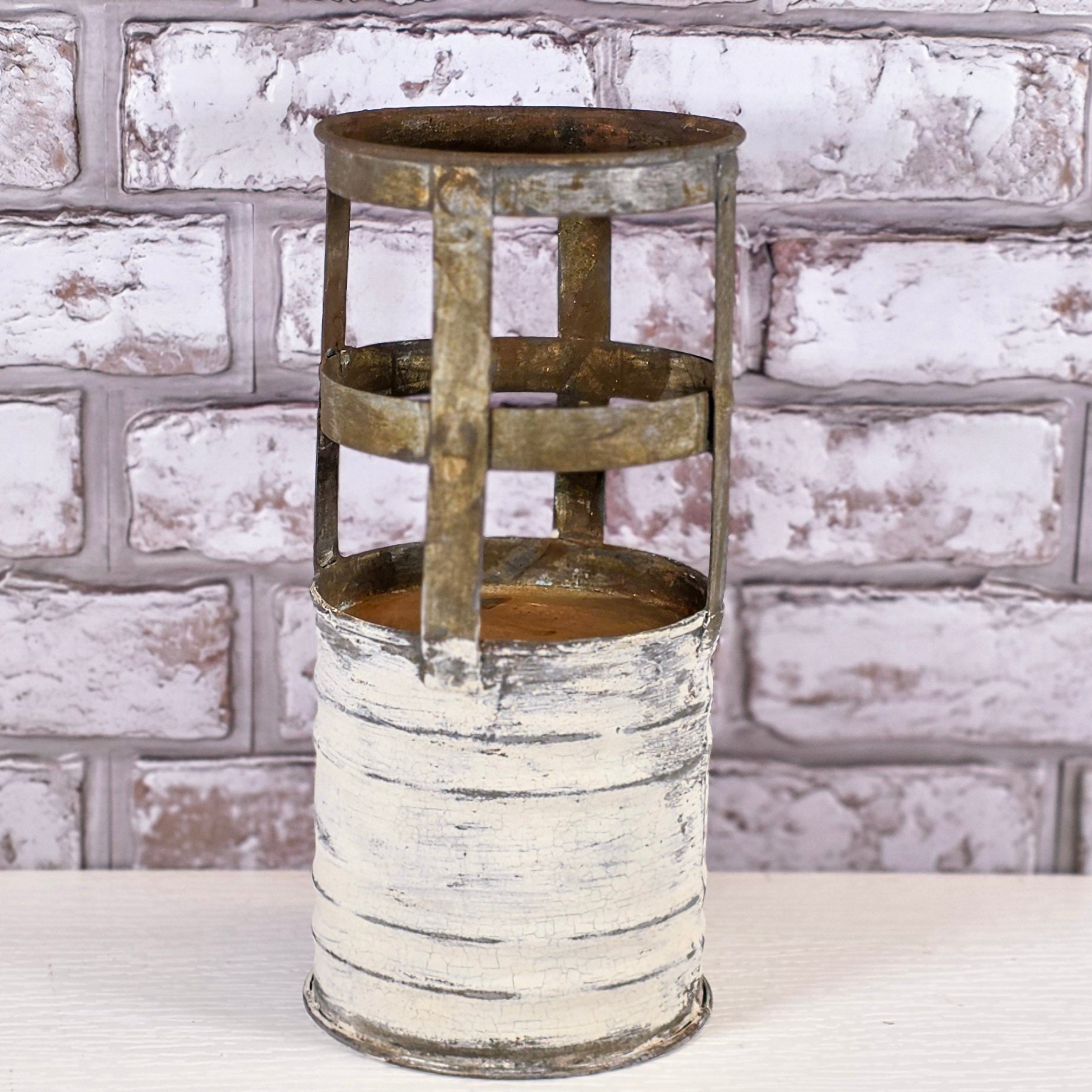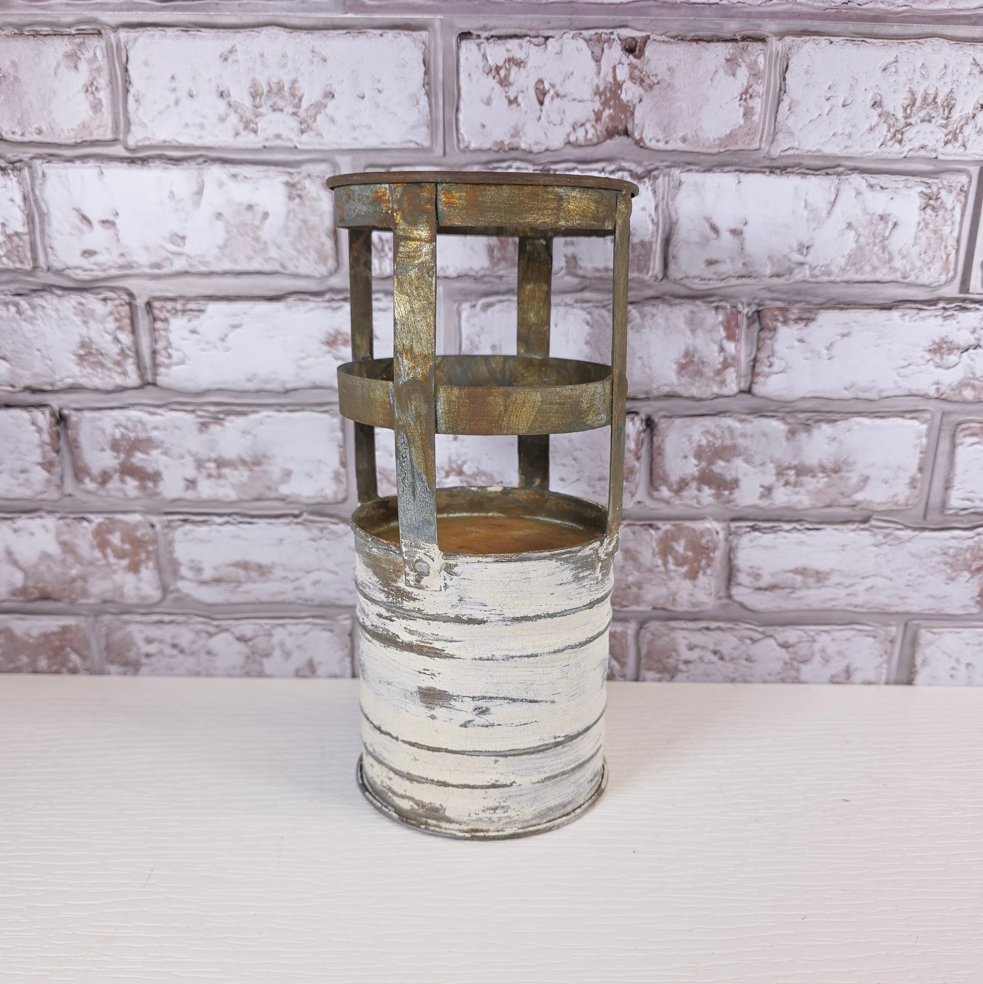 This upcycled galvanized metal canister has been transformed with milk paint and patina for a beautifully chippy, timeworn finish. The layered texture and rustic character give it the look of an authentic vintage industrial piece while still being sturdy and functional as decor.