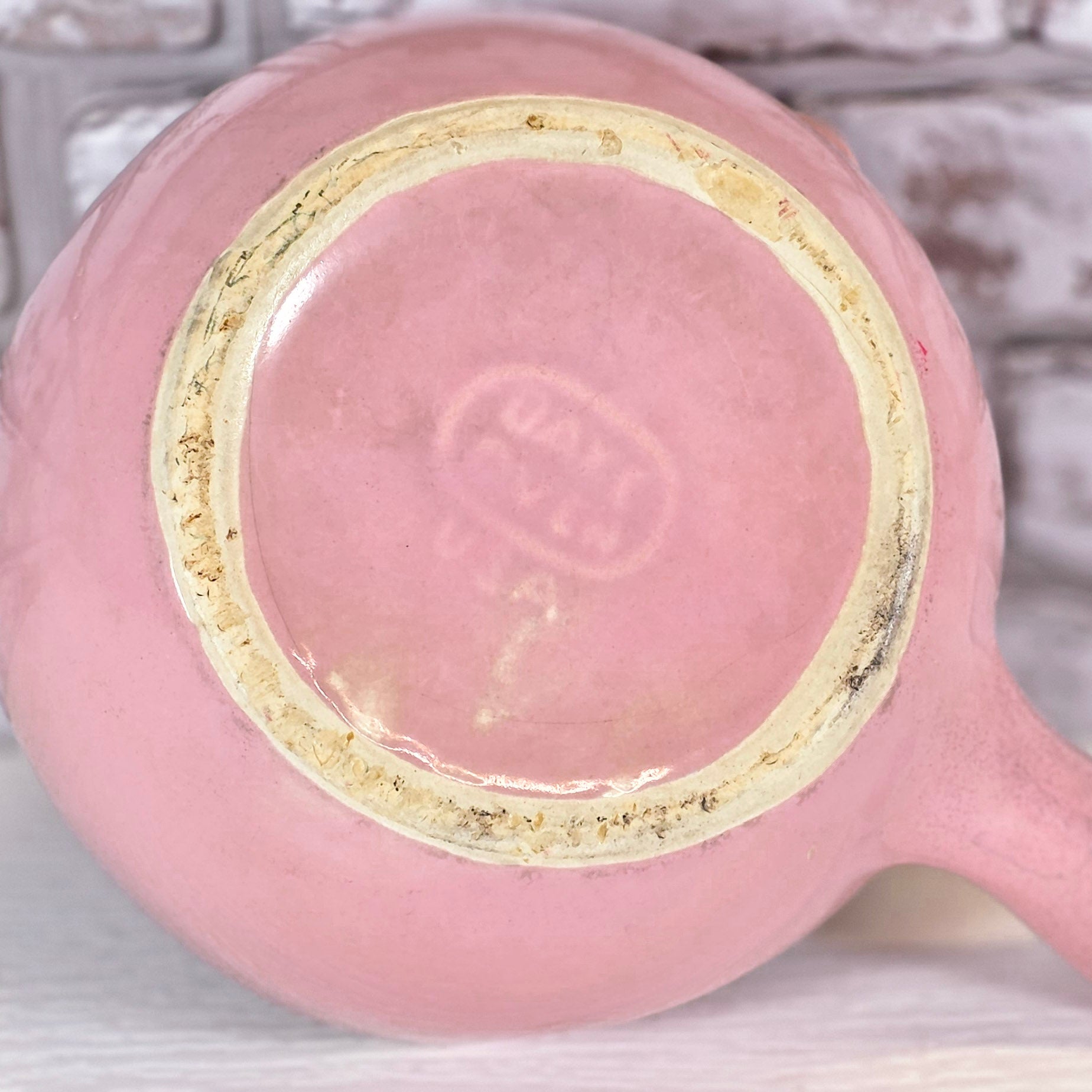 This vintage Hall Pottery pink soup bowl features a classic rounded shape with an integrated handle and soft blush glaze. A timeless piece of mid-century American pottery that works beautifully in both vintage collections and cottage-style decor.