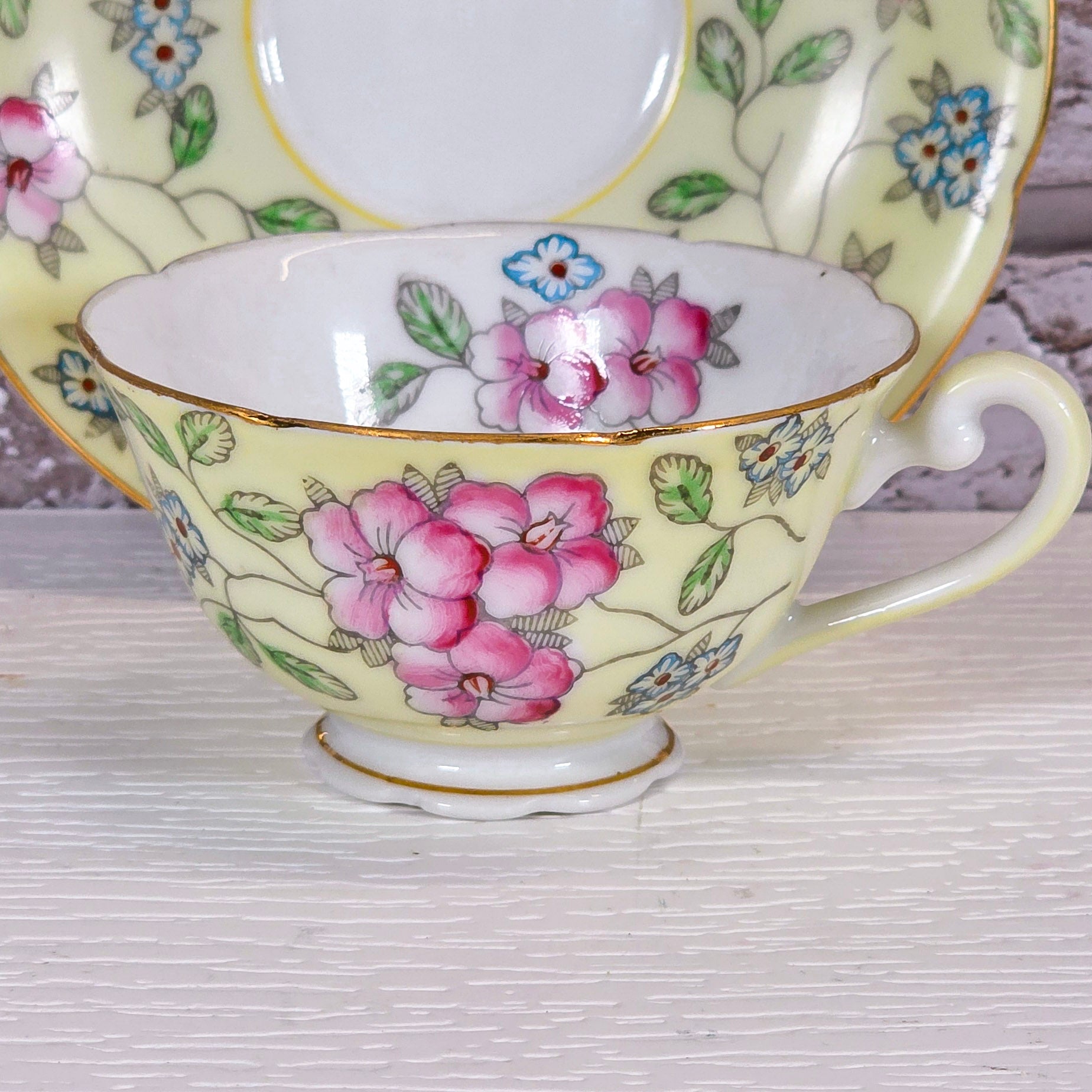 The set features a soft yellow background with hand-painted pink floral designs, green foliage, and delicate gold trim along the rim, base, and handle. The teacup has a classic footed shape with an elegant curved handle, paired with a matching saucer that complements the floral motif.
